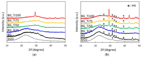 Phase identification by XRD of bioceramics composed of silica and titanium oxide with various concentrations of titanium oxide soaking in SBF for (a) 0 days and (b) 7 days.