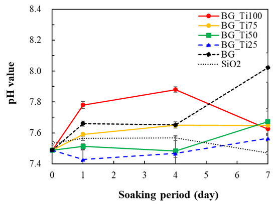 Figure 3 shows the pH value of SBF after the immersion of bioceramics composed of silica and titanium oxide with various concentrations of titanium oxide for 7 days. The pH value of BG dramatically changed after soaking in SBF for 7 days, and the pH value increased to 8.0. This can be due to the basic ions being released in great amounts. The pH value of SiO2 was stable and decreased slightly after soaking in SBF for 7 days, according to the HA deposition on the samples. The pH value of BG_Ti100 obviously increased to 7.8 at the first stage due to the basic ions being released. For BG_Ti25, BG_Ti50, and BG_Ti75, pH values were very close to this, ranging from 7.4 to 7.6, after 7 days soaking in SBF.