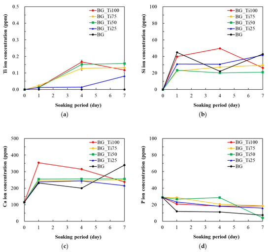 Figure 4 shows several types of ion released in SBF after the immersion of bioceramics composed of silica and titanium oxide with various concentrations of titanium oxide for 7 days, measured using ICP-MS. As shown in Figure 4a, BG released no titanium ions. The BG_Ti25 sample released very little titanium ions (approximately 0.07 ppm) after 7 days of soaking; BG_Ti50, BG_Ti75, and BG_Ti100 released approximately similar concentrations of titanium ions after 7 days soaking. As shown in Figure 4b, BG and BG_Ti25 released the highest concentration of silica ion after 7 days, and BG_Ti50, BG_Ti75, and BG_Ti100 released a similar amount of silica ions at 7 days, and it was worth noting that the concentration of silica of BG_Ti100 varied drastically from time to time. As shown in Figure 4c, BG released the most calcium ion at 7 days. The other bioceramics composed of titanium oxide and silica released similar amounts of calcium ion at 7 days, except BG_Ti100, which released calcium concentrations that varied drastically. The others had a released calcium concentration that remained stable after 1 day. As shown in Figure 4d, BG_Ti25, BG_Ti75, and BG_Ti100 released approximately similar concentrations of phosphate ion. In this regard, the sample that released the lowest concentration was BG_Ti50, followed by BG, at 7 days.