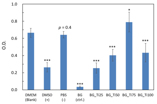 The cell toxicity test of MG63 cells incubating for 1 day in DMEM, DMSO, PBS, the extraction of bioglass, and the extractions of bioceramics composed of silica and titanium oxide with various concentrations of titanium oxide. (* means p value <0.05, ** means p value <0.01, and *** means p value < 0.001).