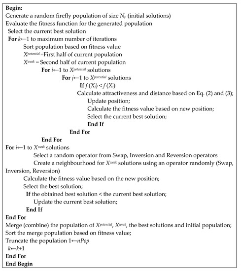 It should be noted that the proposed modified FA (depicted in Figure 3) differentiates from the classical FA by considering the additional operators (swap, reversion and inversion). In other word, the proposed modified FA sorts the population based on fitness value into two groups: potential and weak solution groups wherein classical FA, all population is considered in one group.