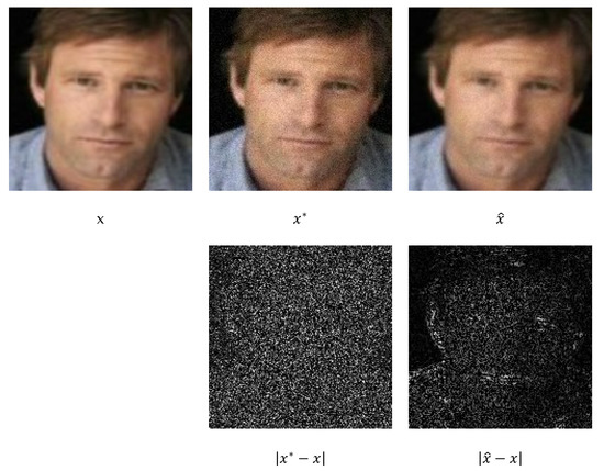 We apply our defensive strategy to existing face recognition models. We use the UDDN network to denoise the attack samples. The result of denoising is shown in Figure 6. x represents the original image of the face, represents the image of the adversarial attack, which is generated by the FGSM algorithm, and represents the image denoised by our proposed UDNN. The next line is the difference between the adversarial image and the original image, and the difference between the denoised image and the original image. We can see that in the details, the image denoised by UDDN is clearer than the image before denoising, and more consistent with the original image.