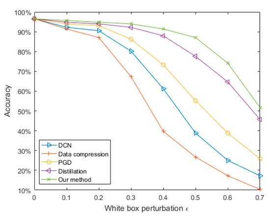 We can see from Table 5 that our proposed strategy has achieved good results on these models. In the white-box attack, compared with the unprotected model, our proposed defensive strategy can improve the accuracy of the model by about 40%. In the black box attack, we can increase the accuracy of the model by 10%. The results prove that our proposed algorithm applies to all DNN-based network models, and compared with other defense strategies, our model achieves the highest accuracy. Therefore, our proposed strategy is more resistant against adversarial attacks.