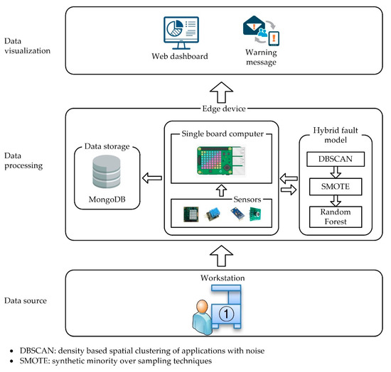 This section describes the overall design for the proposed affordable fast early warning system (AFEWS) system. Figure 1 shows that the proposed AFEWS system consists of an edge device and visualization tools. The edge device consists of single board computer (SBC), sensors, hybrid fault model, and data storage, and gathers and processes environmental conditions from the workstation. The hybrid fault model embedded in the edge device triggers alert/warning messages in fast response when a fault is detected during process. The generated sensor data and prediction results are stored, as well as pushed, to the data visualization layer. Management can monitor the status of every workstation through the web dashboard and receive warning messages via email and/or instant messaging (IM) when a fault is detected.