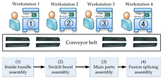 This section describes the proposed AFEWS implementation. AFEWS was implemented for an automobile parts assembly line producing car door trim parts. Four steps were monitored: Inside handle, switch bezel, main parts, and fusion splitting assembly, as shown in Figure 2. The assembly line required approximately 5 min to perform each process step. We identified fault cause for the door trim process. If the worker screwed and/or hammered too hard, the product would break, causing a process fault.