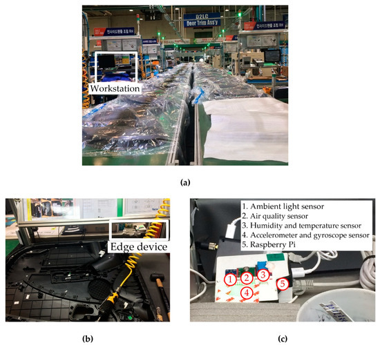 Proposed AFEWS implementation: (a) door trim assembly line, (b) workstation, (c) edge device.