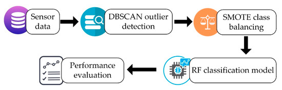 We used the hybrid fault model, combining DBSCAN [15], SMOTE [16], and RF [46], to predict normal and abnormal events during process, as shown in Figure 4.