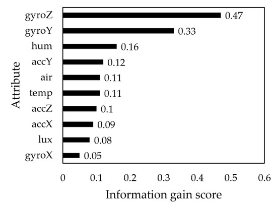 We used preprocessing to remove inappropriate data and correct for missing values, with attribute and class parameters shown in Table 2. The air quality sensor provided categorical values (clean (CL), light pollution (LP), moderate pollution (MP), and severe pollution (SP)), hence the statistical distribution could not be derived for this attribute. Figure 5 shows the information gain [28] significance for each attribute. Gyroscope Z and Y directions (gyroZ and gyroY, respectively) had the maximum affect for abnormal events.