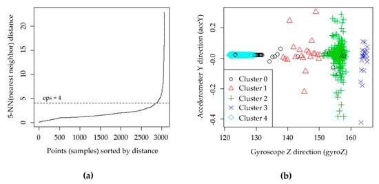 Due to imperfect sensing devices and network connection problems, some sensor data may be significantly noisy or outliers. Therefore, we filtered the sensor data using DBSCAN [15] implemented in R V3.5.1 [47] to remove outliers, having previously determined optimal values for epsilon (eps = 4) and minimum points (MinPts = 5), neighborhood radius around a data point and minimum value of neighboring data points, respectively. We defined eps by calculating the average distance of every point to its k-nearest neighbors, using R V3.5.1 [47]. Figure 6a,b show the sorted k-nearest neighbor (NN) distribution and DBSCAN outlier detection, respectively. DBSCAN grouped the sensor data into four clusters, labelled 1–4, with cluster 0 representing un-clustered data, regarded as outliers. A total of 39 outlier instances were identified (of 614), and the remaining 575 were used for further analysis.