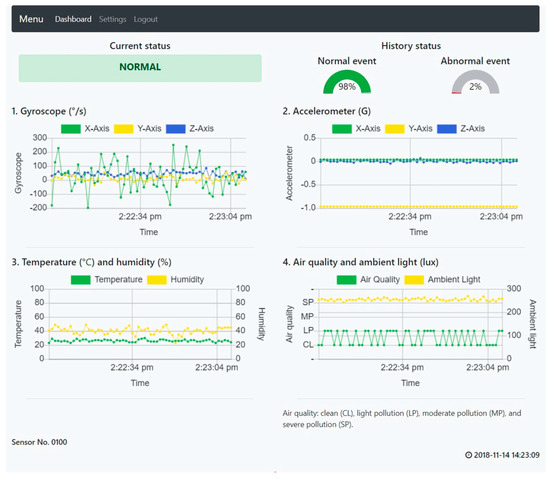 - Affordable edge computing system. The proposed system employed an edge device based on an open source single-board computer (SBC), providing low cost, good support, and sufficient computation resources. Sensor devices were combined with the SBC to gather, process, analyze, and present the sensor data and consequential results in a web dashboard without requiring network communication to the cloud server, thus minimizing network latency and improving analysis speed.
