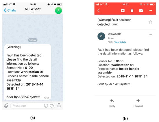 The web dashboard was developed using several open source software (OSS), including Node.js V10.13.0, Express JS V4.16.0, Bootstrap V4.1.3, Chart.js V2.7.3, and Socket.IO V2.1.1. We employed Node.js as a webserver, whereas Express Js, Bootstrap, and Chart.js were used for visualization. Socket.IO was used to handle and present sensor data and prediction results in fast response. When the web dashboard initiates, the local IP address and port are visible and can be accessed through a web browser on computer, smartphone, or tablet connected to the local network. Figure 7 shows how the web dashboard presents sensor, i.e., gyroscope, accelerometer, temperature, humidity, ambient light, and air quality. The sensor number represents the process identification for the workstation for that specific process. The hybrid fault model was applied within each edge device to predict the fault state, which was presented to the web dashboard in fast response. Once a fault was detected, the warning message was immediately generated, sent to the web dashboard and subsequently to registered contacts by email and/or IM, as shown in Figure 8. Thus, managers can immediately notice the fault and take action to prevent further losses during process.