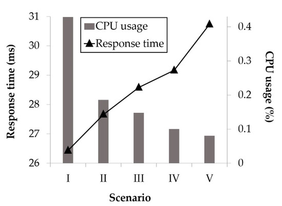 Figure 9 shows the mean response time and CPU usage under the different scenarios. Response time significantly increased with increasing sensor data stored to the database, whereas CPU usage decreased. Thus, storing sensor data less frequently, e.g., scenario V, generated the least CPU usage. However, response time and CPU usage were less than 0.05 s and 0.5% for all scenarios, and scenario III provided optimal tradeoff between response time and CPU usage for this study, although this would requires case by case investigation for other implementations. Thus, the proposed edge device has sufficient capability to gather and store sensor data with relatively low CPU usage and response time.