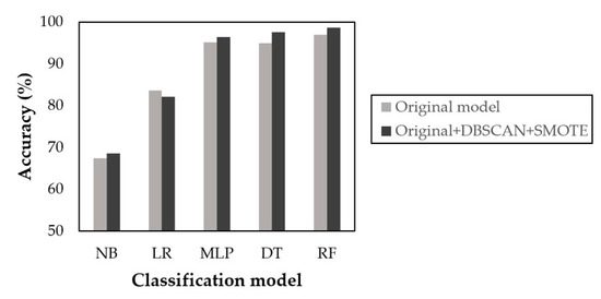 DBSCAN and SMOTE impacts for classification accuracy. NB = Naïve Bayes, LR = logistic regression, MLP = multilayer perceptron, DT = decision tree, RF = random forest.
