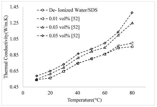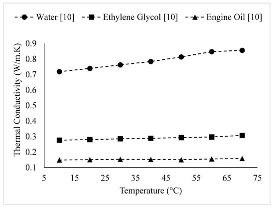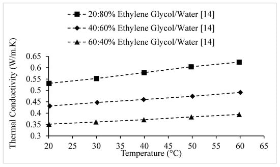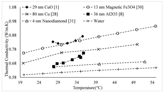 The thermal conductivities of various water-based nanofluids, at , are shown in Figure 5 as a function of temperature, in comparison to the thermal conductivity of water as a function of temperature. It is observed that the thermal conductivity of nanofluids increases with temperature, however not all nanofluids increase at the same rate. It is observed that for all nanofluids, other than nanodiamond–water nanofluid, the slopes of the nanofluid thermal conductivities as a function of temperature are different from the slope of increase in the thermal conductivity of water. Therefore, it can be suggested that the increase in thermal conductivity with temperature of a nanofluid is not only caused by the base liquid, but by the nanofluid as a whole. The data shown in Figure 14 further reinforces this suggestion, by showing that the thermal conductivities of Al2O3–Ethylene Glycol nanofluids also did not increase with temperature at the same rate as the base liquid, Ethylene Glycol.