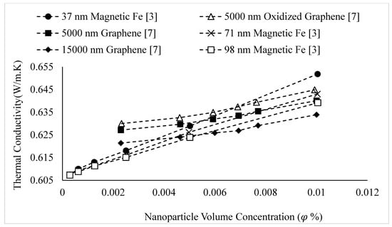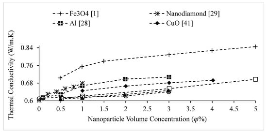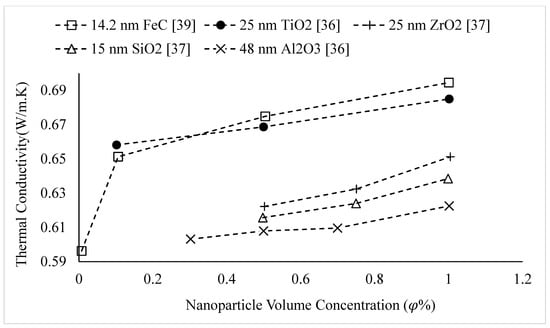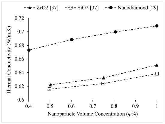 The effect of nanoparticle concentration on the thermal conductivity of water-based nanofluids at room temperature is shown in Figure 19. For all nanofluids, the thermal conductivity increases with nanoparticle volume concentration (, while the rate of increase in thermal conductivity becomes smaller at higher concentrations. This decrease may be a result of nanoparticle clustering at higher concentrations. Figure 20 further reinforces the observations of Figure 19, showing that the thermal conductivity increases with nanoparticle volume concentration (. It is observed that the rate of increase in thermal conductivity becomes slightly smaller at higher concentrations for nanodiamond nanofluids, whereas the rate of increases becomes larger at higher concentrations for SiO2 and ZrO2 nanofluids.