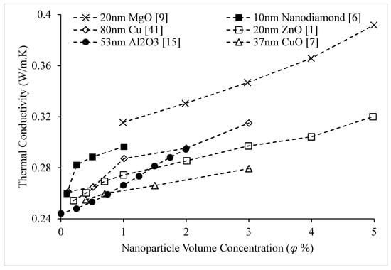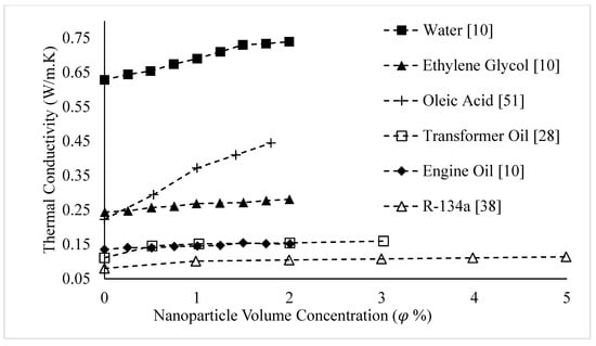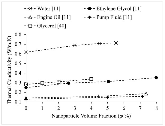 Figure 15 and Figure 16 show that the thermal conductivity of the base liquid has a significant impact on nanofluid thermal conductivity enhancement. The thermal conductivities of nanofluids composed of CuO nanoparticles dispersed in various base liquids are shown in Figure 16 as a function of nanoparticle volume concentration, . The thermal conductivities of the base fluids are shown at . It is observed that the thermal conductivity of nanofluids increases with the thermal conductivity of the base fluid. The low rate of increase in thermal conductivity with concentration for engine oil-based nanofluid may be a result of weak interactions between the CuO nanoparticles and engine oil causing a weak interfacial layer. The observations of Figure 16 are reinforced by Figure 15. Figure 15 shows the thermal conductivities of nanofluids composed of Al2O3 nanoparticles dispersed in various base liquids as a function of nanoparticle volume concentration, . The thermal conductivity of base liquids is given in Table 2.