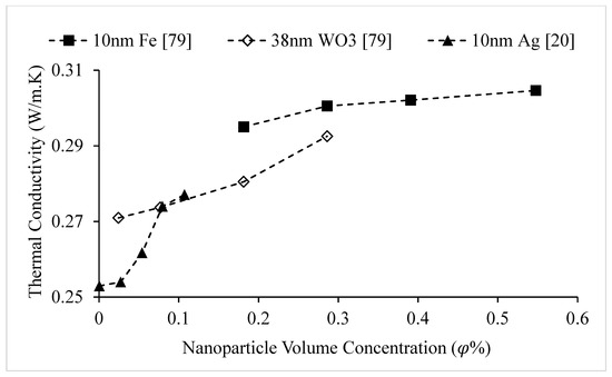 The thermal conductivities of water-based nanofluids containing various nanoparticles, are shown in Figure 1 as a function of temperature, at a nanoparticle volume concentration of It is observed that for a given temperature, the thermal conductivity of CuO–water nanofluid is higher than the thermal conductivity of Cu–water nanofluid. These results contradict -the observations made by Milanese et al. [44], who observed a thermal conductivity of 0.706 for 50 nm Cu nanoparticles dispersed in water, and a thermal conductivity of 0.67 for 30 nm CuO nanoparticles dispersed in water, at a nanoparticle volume concentration and a temperature of 30 °C. It is also observed that the thermal conductivity of nanodiamond–water nanofluid is very low despite the high intrinsic thermal conductivity of nanodiamond 1000 within the temperature range of 27–52 °C, for the thermal conductivity of nanodiamond–water nanofluid ranged from 0.66–0.69 . Yegameha et al. [29] also observed relatively low values for the thermal conductivity of nanodiamond–water nanofluids. Within the temperature range of 20–60 °C, for the thermal conductivity of nanodiamond–water nanofluid ranged from 0.67–0.80 . The thermal conductivities of nanofluids composed of various nanoparticles dispersed in water at room temperature are shown in Figure 2 as a function of nanoparticle volume concentration, for concentrations below It is observed that for a given nanoparticle concentration, 5000 nm oxidized graphene nanofluid has higher thermal conductivity than the nanofluid composed of unoxidized graphene nanoparticles having the same size, despite the nanoparticles having the same thermal conductivity. This may be a result of the greater stability of the nanofluid containing oxidized graphene nanoparticles. It is also observed that the thermal conductivity of 5000 nm graphene–water nanofluid is higher than that of 15,000 nm graphene–water nanofluid, which is likely caused by the smaller size of the 5000 nm particles. The thermal conductivities of nanofluids composed of various nanoparticles dispersed in water at room temperature are shown in Figure 3 as a function of nanoparticle volume concentration, for concentrations below It is observed that the thermal conducitivity of TiO2–water nanofluid is higher than that of Al2O3–water nanofluid. This may be a result of the smaller size of the TiO2 nanoparticles. The thermal conductivities of nanofluids composed of various nanoparticles dispersed in water at room temperature are shown in Figure 4 as a function of nanoparticle volume concentration, for concentrations below Despite the low thermal conductivity of Fe3O4 in comparison to other oxide nanoparticles, it is observed that the thermal conductivity of Fe3O4–water nanofluid is unexpectedly high. This may be a result of more significant clustering and alignment of the Fe3O4 nanoparticles in comparison to other oxide nanoparticles dispersed in water [1]. It is also observed that the thermal conductivity of Al–water nanofluid is higher than the thermal conductivities of nanofluids containing oxide nanoparticles, other than Fe3O4. This may be a result of the higher intrinsic thermal conductivity of metals in comparison to metal oxides. The thermal conductivities of water-based nanofluids containing various nanoparticles are shown in Figure 5 as a function of temperature, at a nanoparticle volume concentration of It is observed that for a given temperature, the thermal conductivity of Fe3O4–water nanofluid is higher than that of the CuO–water nanofluid. This observation is inconsistent with Figure 1, in which it is observed that the thermal conductivity of CuO–water nanofluid is slightly higher than that of Fe3O4–water nanofluid for a given temperature, at The thermal conductivities of nanofluids composed of various nanoparticles dispersed in Ethylene Glycol at room temperature are shown in Figure 5 as a function of nanoparticle volume concentration, for concentrations below . It is observed that nanodiamond–Ethylene Glycol nanofluid has a higher thermal conductivity than other nanofluids, besides MgO–Ethylene Glycol nanofluid, for a given nanoparticle volume concentration. The higher thermal conductivity of nanodiamond–Ethylene Glycol nanofluid may be a result of the combination of the high thermal conductivity of nanodiamond, and the strong compatibility between nanodiamond particles and Ethylene Glycol base fluid, which is caused by the carboxyl and hydroxyl groups on the surfaces of the nanodiamond particles having strong interactions with polar Ethylene Glycol in an alkaline environment (having a PH value higher than 7.0) [45]. It was also observed that for concentrations greater than the thermal conductivity of Al2O3–Ethylene Glycol nanofluid was higher than that of CuO–ethylene nanofluid. The opposite was observed for Al2O3–water and CuO–water in Figure 4. The thermal conductivities of nanofluids composed of various nanoparticles dispersed in Ethylene Glycol at room temperature are shown in Figure 6 and Figure 7 as a function of nanoparticle volume concentration, for concentrations below The Fe–Ethylene Glycol and WO3–Ethylene Glycol nanofluids contained no surfactant, whereas Gum Arabic surfactant was used in the Ag–Ethylene Glycol nanofluid. It was observed that the Gum Arabic surfactant did not have a significant impact on the thermal conductivity of the Ag–Ethylene Glycol nanofluid. The thermal conductivity of Ag–Ethylene Glycol nanofluid was not able to be tested at concentrations higher than those shown due to agglomeration and settling. The settling of nanoparticles resulted in lower concentrations of particles dispersed near the hot wire, leading to measurements showing a lower rate of increase in thermal conductivity at higher nanoparticle volume concentrations [23]. It is also observed that the thermal conductivity of Fe–Ethylene Glycol nanofluid is higher than tha