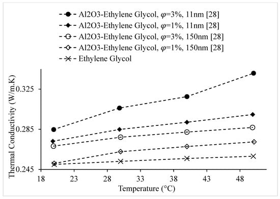 Variation of Al2O3–Ethylene Glycol nanofluid thermal conductivity as a function of temperature, for with 11 nm diameter and 150 nm diameter particles.