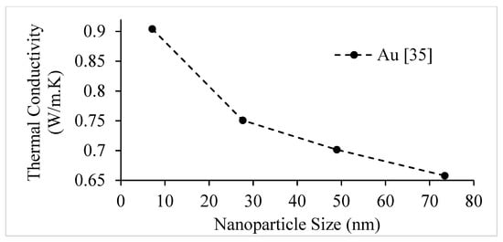 Variation of Au–water nanofluid thermal conductivity at room temperature as a function of nanoparticle size, for a nanoparticle volume concentration of .