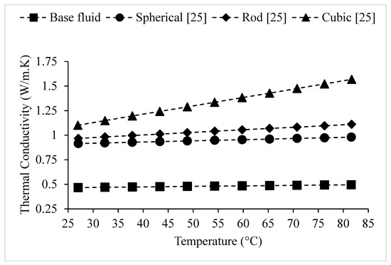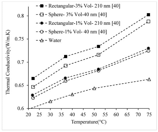 Effect of nanoparticle shape on the thermal conductivity of TiO2–water nanofluid at %, as a function of temperature.