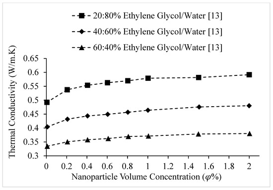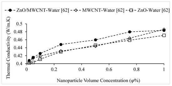 Recently, researchers have conducted experiments on nanofluids containing multiple types of nanoparticles. These nanofluids are called hybrid nanofluids. Experimental data has shown that similarly to nanofluids containing one type of nanoparticle, the thermal conductivity of hybrid nanofluids generally increases with temperature and nanoparticle volume concentration [59,60,61,62,63,64]. In many cases, researchers combined metal or metal-oxide nanoparticles with various types of carbon nanotubes [55,59,60,61,62,65]. For example, using a KD2 Pro Thermal Properties Analyzer, Zadkhast et al. [65] tested the thermal conductivity of CuO–MWCNT–water nanofluid. It was observed that the thermal conductivity of the nanofluid increased with both temperature and nanoparticle volume concentration, having a more significant increase with temperature at higher nanoparticle concentrations. It was suggested that the increase with temperature was a result of increased Brownian motion, while the increase with concentration was a result of the greater area for heat transfer and possible clustering of the nanoparticles. In the same way, Esfe et al. [60] measured the thermal conductivity of SWCNT–Al2O3–water nanofluid. A non-linear increase with both temperature and concentration was observed, with a stronger dependence on temperature shown at higher nanoparticle concentrations. It was suggested that this was a result of increased collisions of the nanoparticles due to Brownian motion. Additionally, using a KD2 Pro Thermal Property Analyzer, Esfe et al. [62] measured the thermal conductivity of ZnO–MWCNT–50/50 Ethylene Glycol–water nanofluid. The results are shown in Figure 26. A non-linear increase with both temperature and concentration was observed. It was suggested that the increase with temperature was a result of Brownian motion, whereas the increase with nanoparticle volume concentration was a result of the increased surface area to volume ratio allowing for more effective heat transfer, along with a greater number of particles, resulting in a greater number of collisions. Through comparing the collected data for the hybrid nanofluid with previously collected data for MWCNT–water and ZnO–water nanofluids, it was observed that for a given concentration, the hybrid nanofluid had a greater thermal conductivity. Additionally, it was suggested that the hybrid nanofluid was a more efficient choice, due to its lower cost in comparison to a nanofluid containing solely MWCNTs in a higher concentration. Using the same method, Afrand et al. [61] conducted experiments to explore the effects of concentration and temperature on MgO–functionalized MWCNT–Ethylene Glycol nanofluid. A non-linear increase with concentration was observed. It was suggested that this increase was a result of clustering of the nanoparticles creating paths with low thermal resistance, thus leading to accelerated heat transfer, and therefore increased thermal conductivity. However, while the thermal conductivity continually increased, the percent enhancement was lower at concentrations above It was suggested that this was a result of increased van der Waals forces resulting in increased size of the clusters. It was suggested that the increased thermal conductivity with temperature was a result of increased Brownian motion. Using the thermal hot plate method, Trinh et al. [59] measured the thermal conductivity of Ethylene Glycol -based nanofluid containing nanoparticles composed of Cu bonded to the surfaces of MWCNTs and graphene sheets. A non-linear increase was observed with both temperature and nanoparticle concentration. It was suggested that the increase with temperature was a result of increased Brownian motion, while that with concentration was a result of the increased area for heat transfer. It was also suggested that the Cu and MWCNTs prevented stacking of the graphene sheets, also contributing to increased thermal conductivity. In addition, although experimental data has shown that the thermal conductivity of nanoparticles themselves does not have a significant influence on the thermal conductivity of nanofluids [8,26,32,36], it was suggested that the combination of multiple materials having high thermal conductivity contributed to the enhanced thermal conductivity of the nanofluid. Jana et al. [55] measured the thermal conductivities of Cu–water, Au–water, Cu–CNT–water, and Au–CNT–water nanofluids using a TC-30 instrument which worked based on a modified hot-wire technique. The results showed a lower thermal conductivity for the hybrid nanofluids of Au–CNT–water and Cu–CNT–water nanofluids in comparison to the nanofluids containing a single type of nanoparticle. It was suggested that the decrease in thermal conductivity was a result of possible agglomeration, or a poor interaction between the Au and Cu with the CNT. Also, Leong et al. [66] measured the thermal conductivity of a hybrid nanofluid composed of Cu and TiO2 nanoparticles dispersed in a 50–50 Ethylene Glycol /water mixture. The data collected was compared with data for nanofluids composed of the same base liquid and each nanoparticle, individually. It was observed that the hybrid nanofluid containing PVP surfactant had a higher thermal conductivity in comparison to those containing Gum Arabic and SDS surfactants. It was observed that for a given concentration, temperature, and surfactant, the hybrid nanofluid containing PVP surfactant had a higher thermal conductivity than the nanofluids containing solely Cu or TiO2 nanoparticles. However, for the nanofluid containing Gum Arabic, both the nanofluid containing solely Cu nanoparticles and that containing solely TiO2 nanoparticles had higher thermal conductivities than the hybrid nanofluid, while for the SDS surfactant, the nanofluid containing solely TiO2 nanoparticles had a higher thermal conductivity than the hybrid nanofluid. Esfahani et al. [63] measured the thermal conductivit