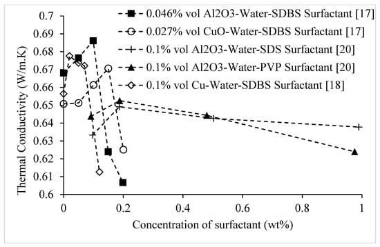 The effects of various surfactants on the thermal conductivities of nanofluids composed of CuO, Cu, and Al2O3 nanoparticles dispersed in water at room temperature are shown in Figure 17. It is observed that the thermal conductivity of nanofluids increases with surfactant concentration up to a maximum value, and then decreases. The decrease in thermal conductivity at higher concentrations of surfactant may be a result of the greater amount of surfactant present on the surfaces of the nanoparticles allowing a narrower area for heat transfer. Brief discussion of effects of surfactant on thermal conductivity of nanofluids is given in Table 3.