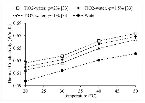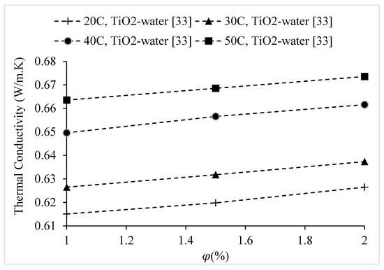 Variation of thermal conductivity of TiO2–water nanofluid at nanoparticle volume concentrations of , as a function of temperature, °C.