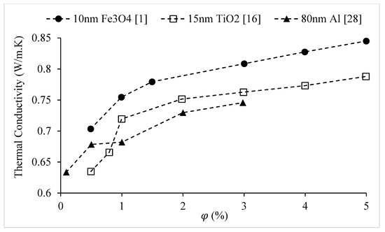 Variation of water-based nanofluid thermal conductivity as a function of temperature for different nanoparticles at .