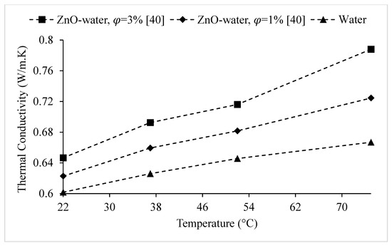 Researchers have conducted experiments to determine the effects of temperature on the thermal conductivity of nanofluids, concluding that the thermal conductivity of nanofluids increases with temperature [5,8,10,12,13,22,25,28,30,31,33,38,39,40,41]. For example, the thermal conductivity of Al2O3–water and CuO–water nanofluids was measured and the results indicated that the rate of enhancement of the effective thermal conductivity increased significantly with respect to increasing temperature [8,41]. Also, Sundar et al. [13] measured the thermal conductivities of magnetic Fe3O4 nanoparticles dispersed in 20%:80%, 40%:60% and 60%:40% by weight Ethylene Glycol/water-based nanofluids. It was observed that the thermal conductivity increased with temperature [13]. In addition, using a KD2 Pro analyzer which worked based on the transient line heat source method, Yeganeh et al. [31] measured the thermal conductivity of nanodiamond–water nanofluid as a function of temperature. A significant increase in thermal conductivity with the increase of temperature was observed. In the same way, Huminic et al. [39] studied the thermal conductivity of FeC–water nanofluid. An increase in thermal conductivity with temperature was observed. Similarly, Das et al. [22] measured the thermal conductivity of Al2O3–water nanofluid and observed an increase with the increase of temperature. It was suggested that this increase was a result of intensified Brownian motion at higher temperatures. Brownian motion is caused by the random collisions of liquid molecules resulting in the random motion of nanoparticles within the base liquid, which in turn leads to greater heat transfer. It was also suggested that the increased microscopic motion caused by Brownian, van der Waals, and electrostatic forces had a significant impact on the increase in thermal conductivity. Also, using a KD2 Pro instrument, Das et al. [33] measured the thermal conductivity of TiO2–water nanofluid as a function of temperature. The results are shown in Figure 21. For each tested nanoparticle volume fraction, the thermal conductivity increased with temperature. The results showed that the temperature had a stronger influence on thermal conductivity at higher temperatures. It was suggested that this relationship was related to enhanced Brownian motion at higher temperatures. Using the same method, Agarwal et al. [12] measured the thermal conductivities of Al2O3–water and Al2O3-Ethylene Glycol nanofluids at temperatures ranging from 10–70 °C. For both nanofluids, at a given nanoparticle volume concentration, the thermal conductivity increased with temperature. The increase was less significant for Ethylene Glycol-based nanofluid. It was suggested that the increase in thermal conductivity with temperature was related to more significant Brownian motion at higher temperatures. It was suggested that water-based nanofluid would be a more appropriate choice for applications involving a significant temperature increase, because the thermal conductivity increased almost constantly with the increase of both temperature and nanoparticle concentration. Using the transient hot-wire method, Raja et al. [5] measured the thermal conductivity of Ag–water nanofluids having nanoparticle volume concentrations less than 1%. It was observed that the thermal conductivity increased with the increase of temperature. It was suggested that the thermal conductivity of nanofluids has a stronger dependence on temperature than base fluid thermal conductivity. Using the same method, Maheshwary et al. [25] measured the thermal conductivity of TiO2–water nanofluid as a function of temperature. For every combination of nanoparticle shape and concentration tested, it was observed that the thermal conductivity increased with temperature. Similarly, Sundar et al. [30] measured the thermal conductivity of magnetic Fe3O4–water nanofluid, containing CTAB surfactant. It was observed that the thermal conductivity increased with temperature. It was suggested that this increase was caused by increased Brownian motion at higher temperatures. Also, using the transient hot-wire method, Jeong et al. [40] measured the thermal conductivity of ZnO–water nanofluid. An increase in thermal conductivity with temperature was observed. In the same way, Sundar et al. [29] measured the thermal conductivity of nanodiamond–water nanofluid and observed an increase with temperature. It was suggested that this was a result of Brownian motion and micro-convection of the nanoparticles. Alawi et al. [38] measured the thermal conductivity of nanofluid composed of CuO nanoparticles dispersed in R-134a refrigerant. The results showed an increase in thermal conductivity with temperature. It was suggested that this increase was a result of increased Brownian motion at higher temperatures. It was also noted that the contribution of microconvection to heat transfer increases with the increase of Brownian motion, which also leads to enhanced thermal conductivity. Patel et al. [28] studied the thermal conductivities of Al2O3–Ethylene Glycol, Cu–water, and Al–transformer oil nanofluids. It was observed that the thermal conductivity increased with temperature. It was suggested that this increase was a result of increased Brownian motion at higher temperatures. Also, using the transient line heat source method, Agarwal et al. [10] measured the thermal conductivities of CuO–water, CuO–Ethylene Glycol, and CuO–engine oil nanofluids as a function of temperature. The results showed an increase in thermal conductivity with temperature for each nanofluid tested. It was suggested that this increase was caused by increased Brownian motion at higher temperatures. However, several researchers have suggested that the effect of temperature on the thermal conductivity of nanofluids is solely a result of the increase in thermal conductivity of the base liquid [15,26,42]. Using the transient short hot-wire