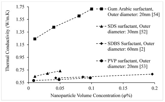 Effect of surfactant on the thermal conductivity of MWCNT–water nanofluid as a function of nanoparticle volume concentration, φ, at room temperature.