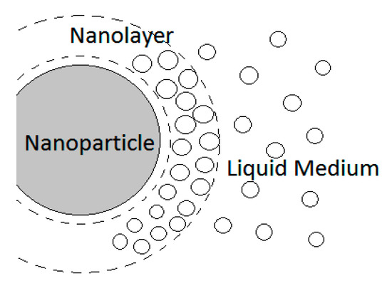 One of the more significant mechanisms behind the increase in thermal conductivity of nanofluids is the formation of a layer of the base fluid around the nanoparticle. The formed layer around the nanoparticle is slightly denser than the surrounding base fluid, yet significantly less dense than the nanoparticle (see Figure 28) [73].