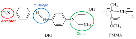 A guest-host polymer system consisting of the azo benzene dye Disperse Red 1 (DR1) in a poly[methyl methacrylate] (PMMA) matrix is employed as the electro-optical medium in this work and is called PMMA+DR1 in the following. The chemical structure of both components is presented in Figure 1. DR1 is a non-centro-symmetric organic chromophore, where the donor and acceptor molecules are bonded through a conjugated -bridge. acts as an acceptor, while the conjugated -bridge allows the transport of charges, which are donated by the alkyl-amino-group. The weakly bound -electrons in this system already offer a charge displacement which leads to a high polarizability through applied electrical fields. Large dipole moments and therefor a high nonlinear optical efficiency are clear advantages of this medium, considering a photonic modulation purpose [12,13]. Additionally, the usage of EO polymers shows low free-carrier dispersion, which usually is the fundamental speed limitation in silicon photonics modulators [14]. Moreover, an intrinsic coupling of amplitude and phase of the EO material can be achieved, making advanced modulation formats such as 16-state quadrature amplitude modulation (16QAM) or quadrature phase-shift keying (QPSK) possible [3,15].