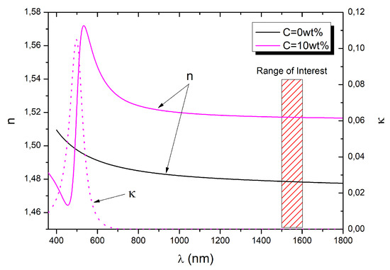 Figure 2 shows the dispersion curves for PMMA+DR1, measured by ellipsometry. The values are given for two different mass concentrations (weight percentages) C in wt% of the DR1 chromophore within the polymer matrix PMMA. The extinction coefficient is zero over the entire wavelength range for , while it has an absorption peak of at for . However, for applications in silicon photonics, the to range (red-striped box) is from great importance, due to the transmission window of silicon [16]. At the optical telecommunication C-band wavelength , the measured refractive indices are and , respectively, showing a normal dispersion behavior.