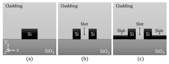 Cross sections of (a) conventional strip-waveguides, (b) slot-waveguides and (c) a slot-waveguide with slabs. The latter is the configuration studied in this work.