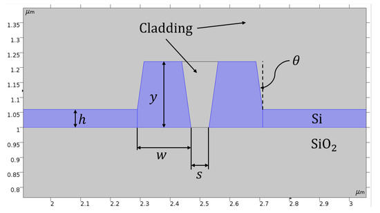 The slot-waveguide design and the denotation of its parameters is presented in Figure 4. Table 1 lists the parameters and their standard values, which are then consecutively varied to investigate the change in the effective refractive index and the field confinement factor. These values are widely used in literature due to their compatibility to typical SOI fabrication processes. The slot width s usually is the independent variable in this study.