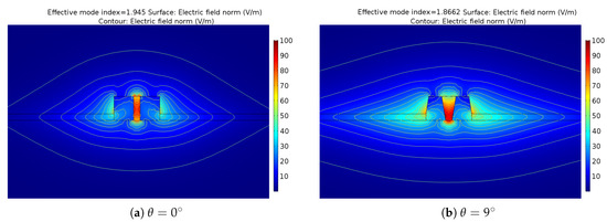 During the fabrication of slot-waveguides, silicon deep etching is applied in order to form the slot region. While doing so, it is often not possible to obtain perfectly vertical sidewalls. Therefore, the sidewalls will be tilted by an angle after etching. This obviously affects the modal-field distribution of the structure, visible in Figure 5. To take these manufacturing tolerances into account, we calculated the impact on the effective refractive index . A linear shift can be observed, increasing with the tilt angle . We defined the percentage of effective refractive index shift at a given tilt angle with respect to perfectly straight sidewalls by