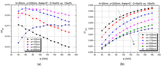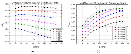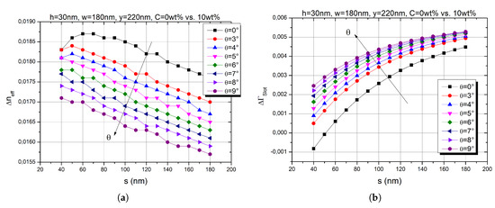 The change ranges from 1.6% to 7.9%, as shown in Figure 6. With increasing slot width s, the influence of the tilt angle becomes less pronounced, due to the relative large distance between the two silicon wires. Comparing Figure 6a,b shows that the difference between both concentration is negligible and, hence, the tilt angle has a more dominant effect on the effective refractive index.