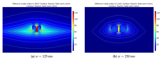 To find the optimal waveguide width w, we studied the changes in a range of to . An increase of w leads to higher values for , decreasing with the slot width s. However, regarding the difference in the effective index between the two concentrations, as shown in Figure 8a, we find a more complex relationship. While shows a maximum for at , it barely changes for over the entire range of s. A greater linear decrease becomes evident for and . In case of even an increase with s up to can be observed. The latter is due to the very wide waveguide wires, where the optical mode less likely enters the slot region, until a certain ratio of is overcome (Figure 9). For the entire range of w no higher modes were observed. A distinct maximum for has been found for and , up to . The difference is very small, though, and even becomes negative below , as shown in Figure 8b.