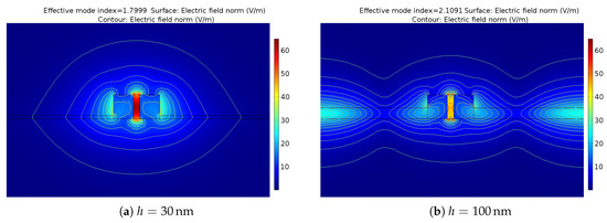 In EO modulators the slab is responsible for contacting the waveguide to the device, in order to apply an electric field to the slot and thereby changing the EO properties of the organic material. A greater slab height h leads to higher values for , while decreases and is more affected by s, presented in Figure 10a. During the simulation study we observed the propagation of higher modes starting from and shown as an extreme example for in Figure 11. This effect was already visible in Figure 10b at , where starts to drop. However, the manufacturing resolution and the electrical properties of the slab have to be taken into account for such small slab heights, which is why larger h become necessary.