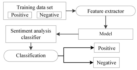 The machine learning-based approach employs a supervised learning technique to train a text classifier using a manually labeled training dataset and extract the features. More specifically, the process can be described as follows. Given a training dataset consisting of labeled text documents, D = {(d1, l1), …, (dm, lm)}, where di represents a document belonging to the initial training corpus, D, and li is the manual label reflecting a specific preset class among the set of classes, L. Here, the main task is to detect unlabeled text data by generating an effective classification model from the labeled training dataset [19]. Figure 1 depicts the structure of Twitter sentiment analysis based on the machine learning approach. Various formats of sources such as blogs, reviews, etc., are utilized as input data for Twitter sentiment analysis. Here, useful features are selected by a feature extractor for subsequent processing, which is critical to sentiment analysis. This is because the combination of different features plays a crucial role in the classification. The classifier is then trained by a machine learning algorithm to evaluate the degree of polarity and assign a corresponding label to the tested instance [25,26,27].