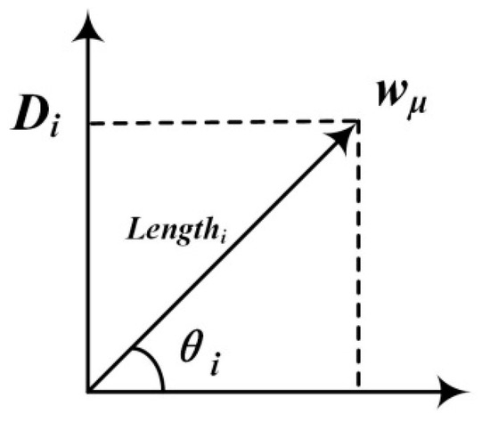 Based on the relative frequency and discriminability, word_wμ is represented as a vector, DisVector, as depicted in Figure 2. Here, the word is located at the origin, and the pointer that originated from it represents the position of the discriminability of the word.