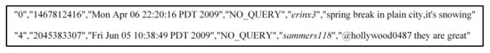The proposed CDS-C scheme is evaluated using Matlab, which consists of three components including the preprocessor, POS tagging API, and Bayes-based text classifier. The preprocessor is performed to remove stop-words and punctuations, and normalize the training dataset into a customized form, which makes it accessible by a POS tagger and features extractor. A Matlab-based function is utilized to implement the Stanford POS tagger [52,53], which offers the API that is used to obtain the POS tag for each word in the training dataset. The Bayes-based text classifier is implemented to apply the Baye’s theorem in the analysis of the orientation of the sentiment and prediction of the polarity (positive/negative) of the tested document. In this paper the MNB classifier is utilized as the text classifier with the assumption of feature independence. The workload in the experiments is extracted from Sentiment 140, which is a benchmark dataset derived from Twitter API, and widely adopted in the sentiment analysis [54]. The workload is composed of 1,600,000 documents of labeled tweets where one half is labeled as positive and the other is labeled as negative. The data of Sentiment 140 covers a wide range of domains and data characteristics [55], and two instances are shown in Figure 3. Each data consists of six attributes: the polarity indicator (0 = negative, 4 = positive), user id, posting time, query condition, username, and text of the tweet. Four metrics are adopted to evaluate the performance of feature weighting in sentiment analysis: accuracy, precision, recall, and F1-score [19].