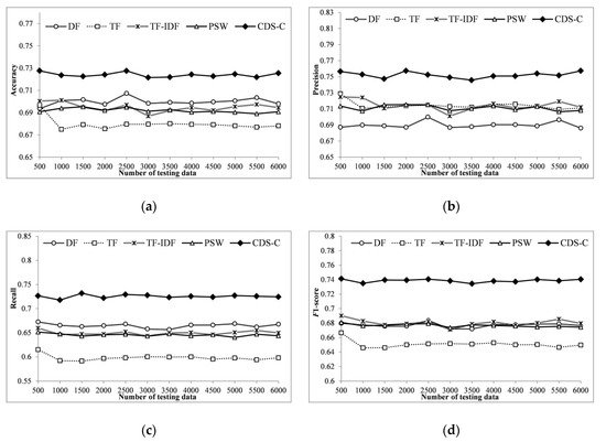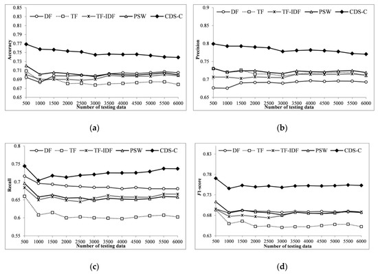 Figure 4 shows the performance of classification of the five schemes when the size of the balanced tested dataset varies from 500 to 6000. Observe from the figures that the proposed CDS-C scheme consistently outperforms the other schemes for all four metrics regardless of the size of the tested data. Evaluating the tweets that have negative and positive polarity of the same size is common. The proposed scheme presents the highest accuracy, precision, recall, and F1-score, which indicates that it is very sensitive to the orientation of sentiment, and is able to classify the tested data into the correct category. This is achieved by the weights that were computed in accordance with both inter-category and intra-category feature relevance, and the discriminative features. Moreover, the proposed models of CDS and IDM properly measure the discriminability of the features of the training dataset, which contributes to quantify the usefulness of the features. In general, the classification performance tends to degrade when the number of the tested data increases. This is because a training corpus of limited size cannot sufficiently cover the increased size of the tested data. As depicted in Figure 4a, the accuracy slightly decreases as the number of tested documents increases from 500 to 6000. Also, it can be seen from Figure 4a,d that the accuracy and F1-score of the DF are superior than TF because considering either the presence or absence of features allows higher classification performance than considering only their frequencies [56].