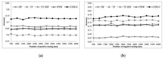 The comparisons of accuracy with the tested documents of different polarity. (a) Positive; (b) Negative.
