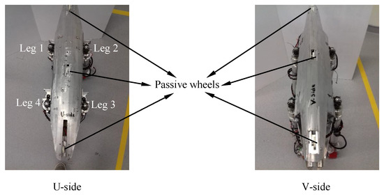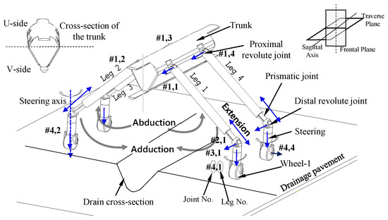 Figure 3 shows the trunk where the four legs were attached to it. Note that the trunk body has U- and V-cross-sections. This was selected as per the geometry of the drainage cross-section (Figure 2). Figure 3 shows the two manually reconfigurable states in which the robot can be placed. This feature will help to place the trunk of the robot parallel to the drain section. Three passive wheels were provided on the top and the bottom of the trunk respectively to prevent it from rubbing the ground. Inside the trunk, a mechanism for the simultaneous actuation of the two proximal revolute joints in frontal planes, i.e., (#1,1, #1,2) and the two rear legs (#1,3, #1,4) was placed. The trunk contains the necessary electronics, energy source, and sensors. It has the suspension mechanism designed to account for both upside and down configurations to safeguard the robot against jerks transmitted from the ground.
