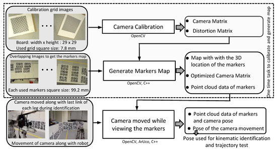 - A methodology to identify the kinematic parameters using ArUco markers and monocular vision for the assembled mobile robot with legs. First, using the calibrated camera, poses of ArUco markers are reconstructed in 3D space. Second, by moving each joint and capturing images, a set of the tracked pose is determined. Then, the DH parameters were evaluated.