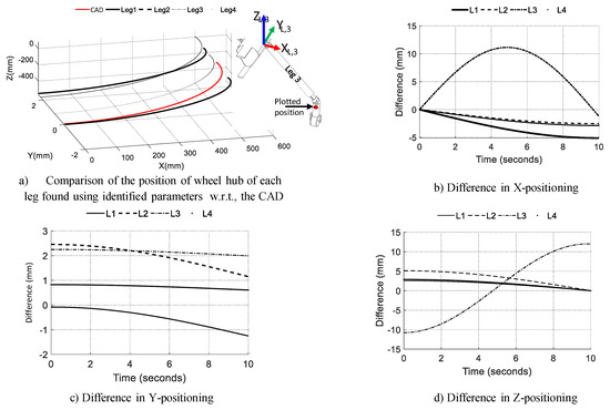 where are the coefficients that were derived from the initial and final state of the joints. The velocity and acceleration for linear actuation and rotation, i.e., can be found by taking the first and second order derivatives of Equation (17). The detailed trajectory equations with its derivatives are discussed in [47]. The trajectory as per Equation (17) was used to actuate the joints from its initial to final position, i.e., within the range of to with quintic profile. Figure 15a shows the variation in the position of the wheel hub plotted in in each of the leg frames. The difference in the X-, Y- and Z-positioning of each leg is plotted w.r.t. the CAD parameters in Figure 15a–c, respectively. The variation in x- and y-directions are significant, and working with the identified values in the kinematic model is useful.