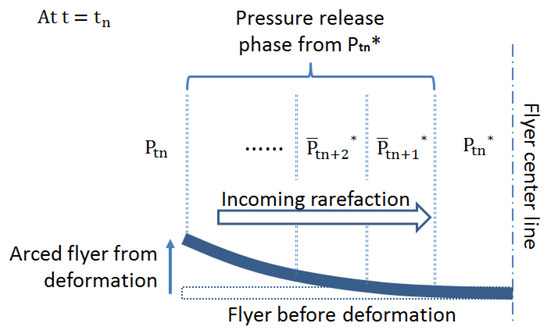 The spirit of this approach is similar with Chanteret’s work, but the description of the rarefaction intrusion and the specific velocity profile for each location on the flyer are greatly emphasized to predict the arc deformation of the flyer.