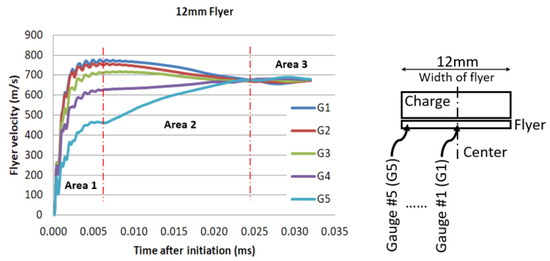 Acceleration stage (Area 1): the gauge near the center of the flyer (G1) experiences delayed rarefaction intrusion, and the flyer segments in this area are with fast and long acceleration duration. However, the gauges near the edge of the flyer (near G5) show fast reduction of the speed and short acceleration duration due to the early rarefaction intrusion. It is believed that the duration of acceleration for each flyer segment is strictly dependent on the speed of rarefaction intrusion to the specific location as was addressed previously [7]. In addition, this stage should be under the hydrodynamic regime, in which each flyer segment projects independently without much effect from the nearby segments.