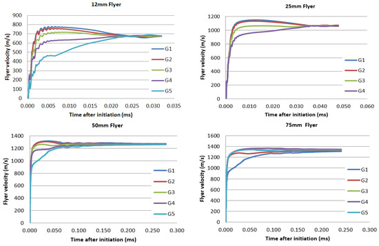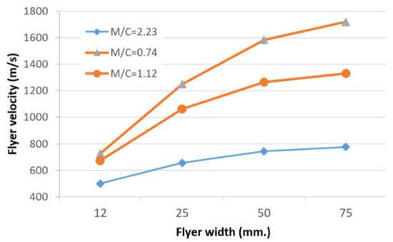 In this series of simulations, four different flyer widths of 12, 25, 50, and 75 (or 100 mm), under varied are simulated, and the results are tabulated in Figure 7, Figure 8 and Figure 9, and Table 1. The flyer’s material is a 2 mm thick, copper flyer, and the explosives charge material is a 10 mm thick, C4 charge (see Appendix A, Table A1 for detailed simulation parameters). The simulation was run until the velocity converging stage in order to observe the entire three stages of velocity profiles.